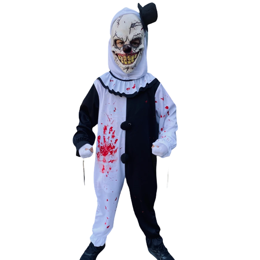 Includes: One Piece Black and White Jumpsuit with Pom Poms, Neck Cowl & Blood Splatters, White Hood with Attached Mini Top Hat, Clown Mask and White Fingerless Gloves.