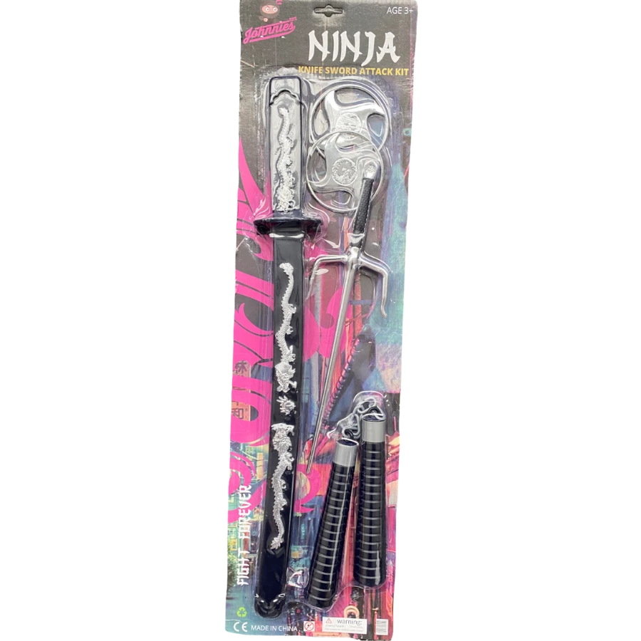 Includes: 1x Samurai Sword with Sheath, 1 x Pair of Nunchuks, 1 x Sai, and 2 Ninja Stars.